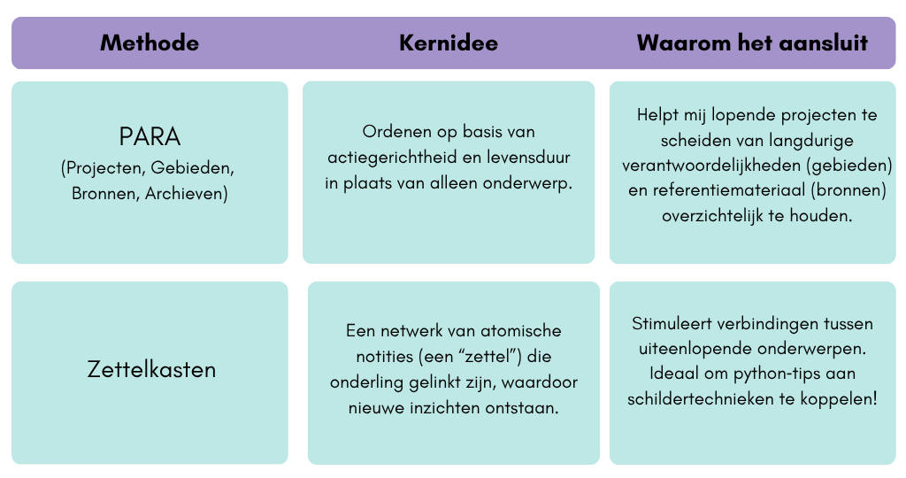 Worstel jij ook met “te veel om te onthouden, te weinig tijd”? En voelen jouw hersenen ook af en toe als een kapotte sticky; alles plakt een beetje, maar niets blijft écht hangen? Probeer deze hybride aanpak eens. Begin klein, leg elke dag een paar items vast, categoriseer ze met PARA, en zie hoe de verbindingen zich vormen.
